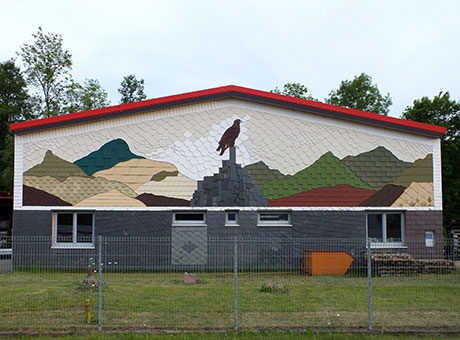 Ornamentarbeiten an der Giebelseite der Firmenhalle Illing